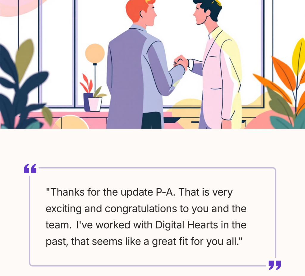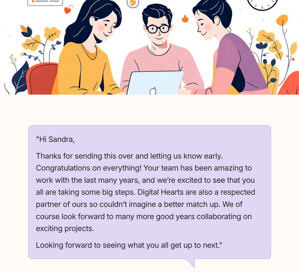 Clients talked about both our teams being “amazing to work with” and how DIGITAL HEARTS was “a great fit” for us. What touched me most, though, was that they were genuinely happy for us, and truly interested in where we are going next together, with our new partner AND with them.