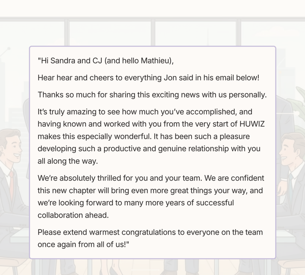 To everyone at HUWIZ and DIGITAL HEARTS who contributed to these relationships, thank you as well. These reactions belong to you. They are the result of the way you show up for our clients and for each other.