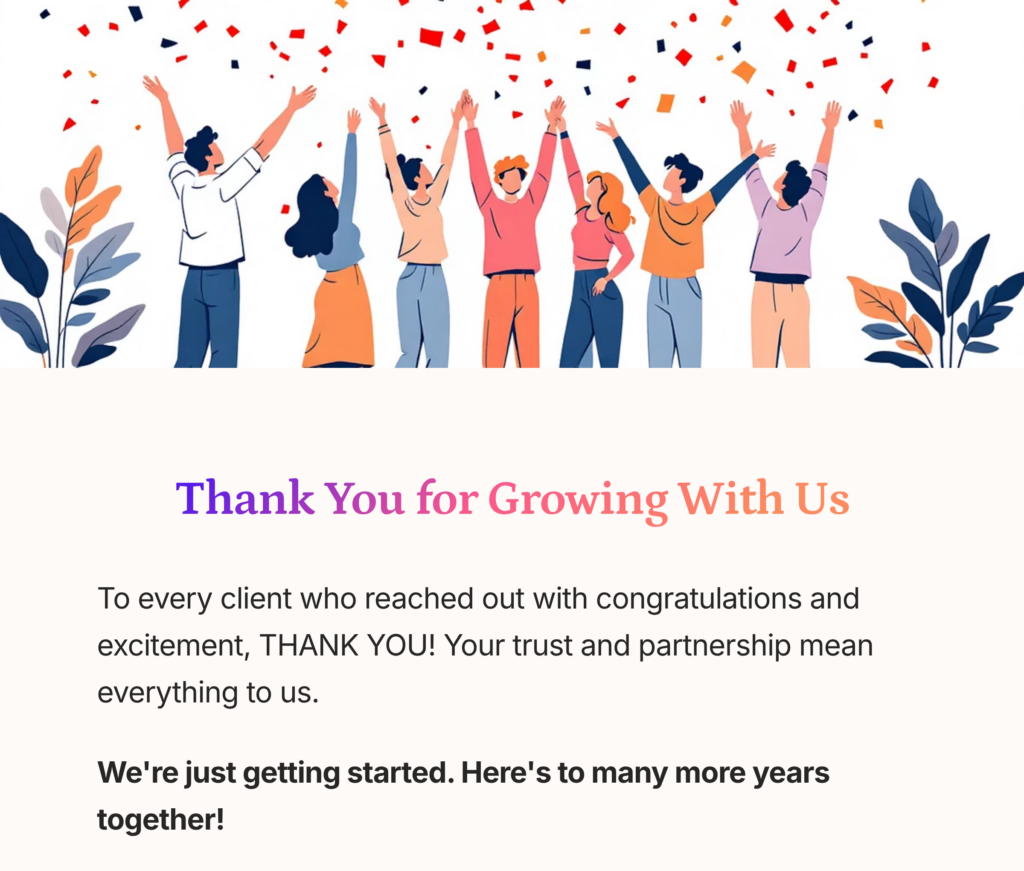 To our clients and partners, thank you. Thank you for your trust, your support, and your honest feedback during this transition. We take that trust seriously, and our goal is simple. Keep earning it, every day, with the same level of care and quality you have come to expect from us.