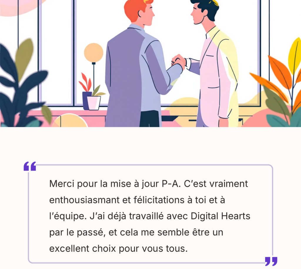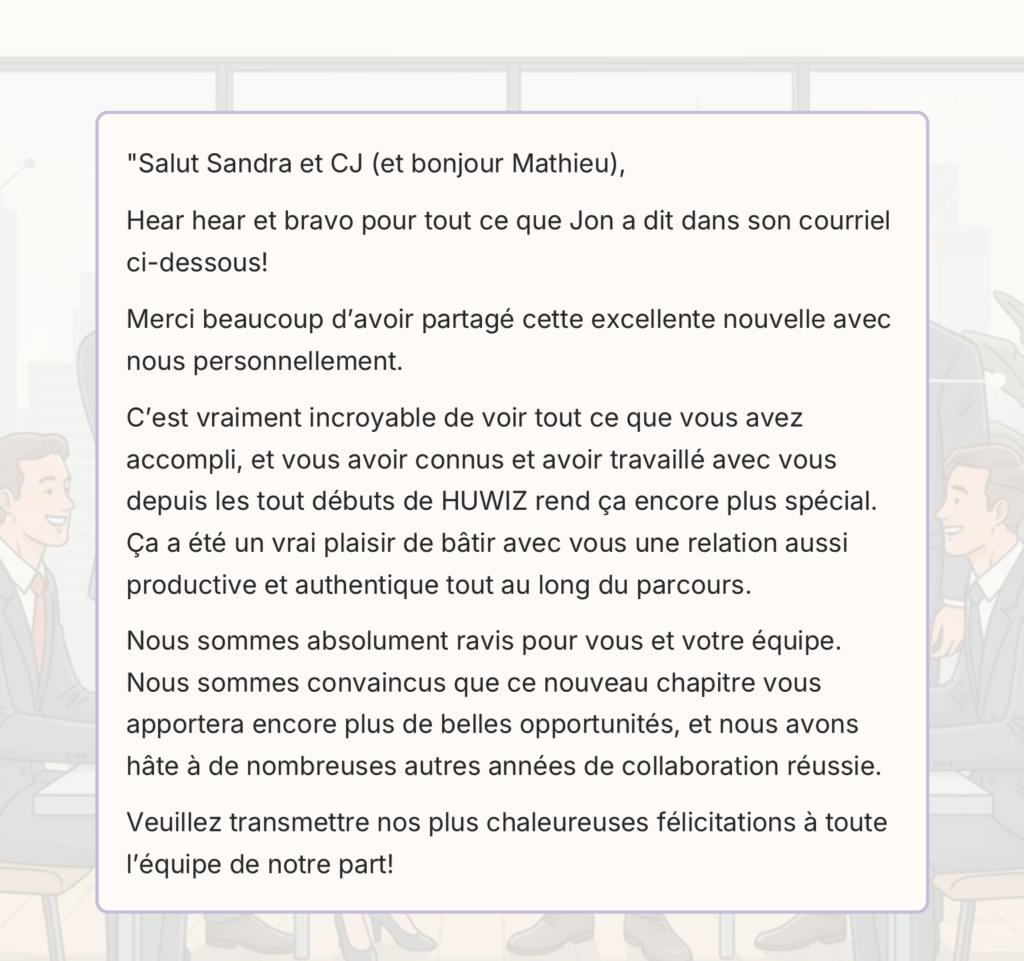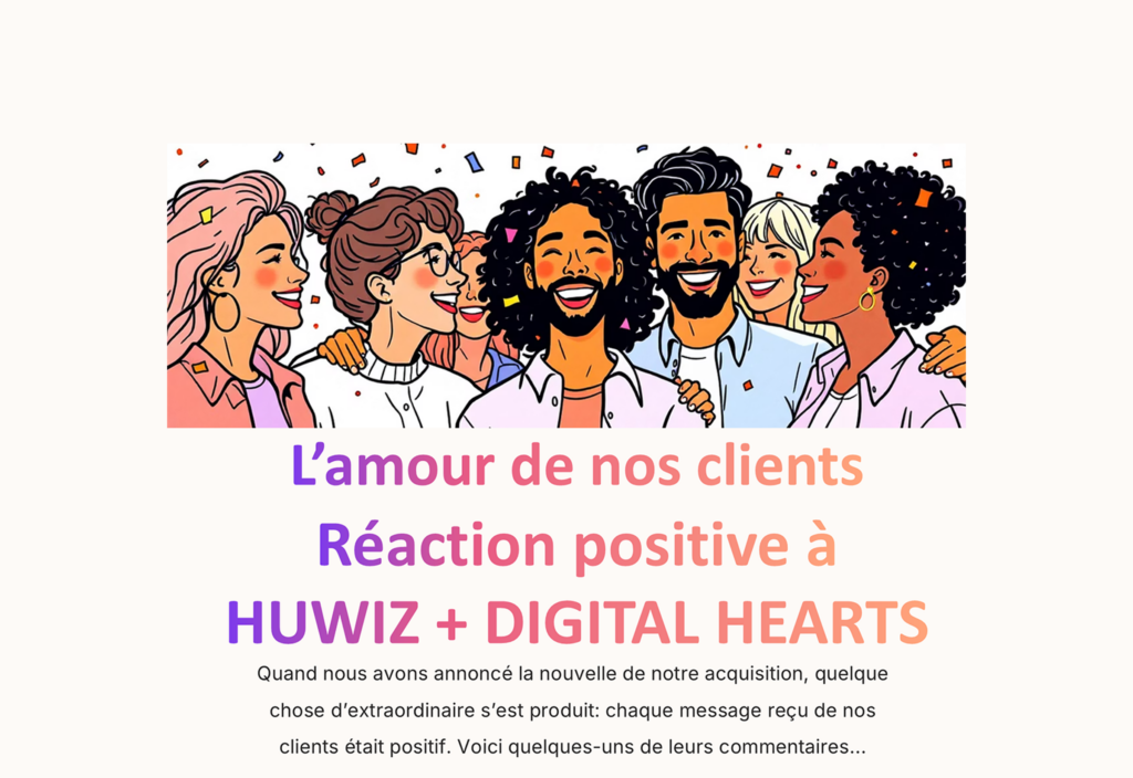 À toutes les personnes de HUWIZ et de DIGITAL HEARTS qui ont contribué à bâtir ces relations, merci également. Ces réactions vous appartiennent. Elles sont le résultat de la façon dont vous êtes présents pour nos clients et les uns pour les autres.