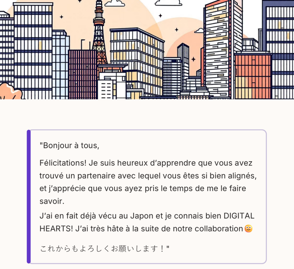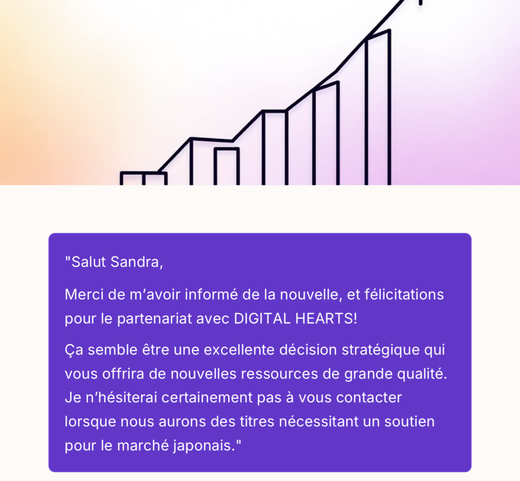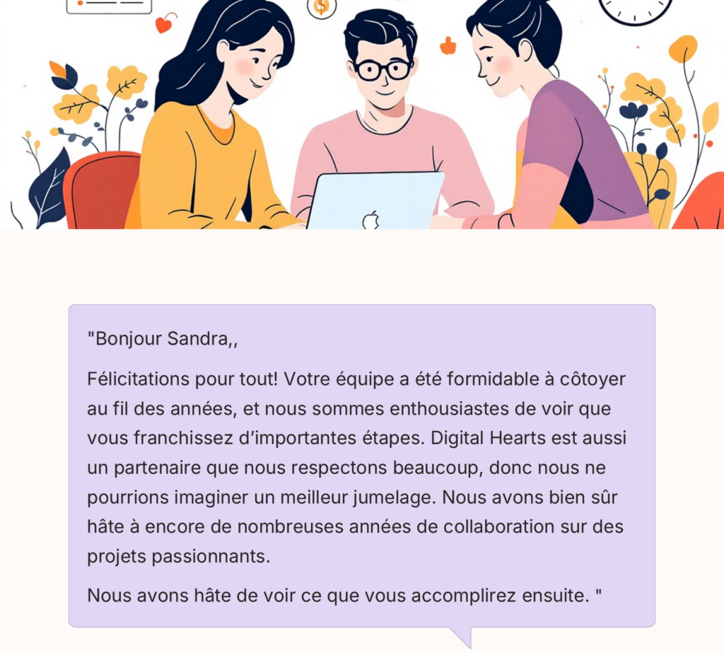 Les clients ont parlé de nos deux équipes comme étant « incroyables à travailler avec » et de DIGITAL HEARTS comme étant « un excellent fit » pour nous. Ce qui m’a le plus touché, par contre, c’est qu’ils étaient sincèrement heureux pour nous et vraiment intéressés à savoir où nous allions ensemble, avec notre nouveau partenaire ET avec eux.